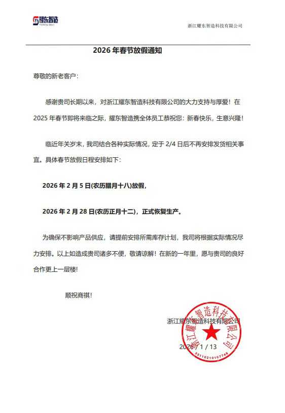 (Zhejiang, [data attuale]) Con l'avvicinarsi del Capodanno lunare, varie industrie hanno iniziato il periodo di revisione e riposo annuale. Oggi, Zhejiang Yaodong Smart Manufacturing Technology Co., Ltd. ha pubblicato ufficialmente il programma operativo del Festival di Primavera, segnando la conclusione positiva dei suoi sforzi di produzione e consegna nel 2025 e l'inizio dello sprint finale prima delle vacanze.